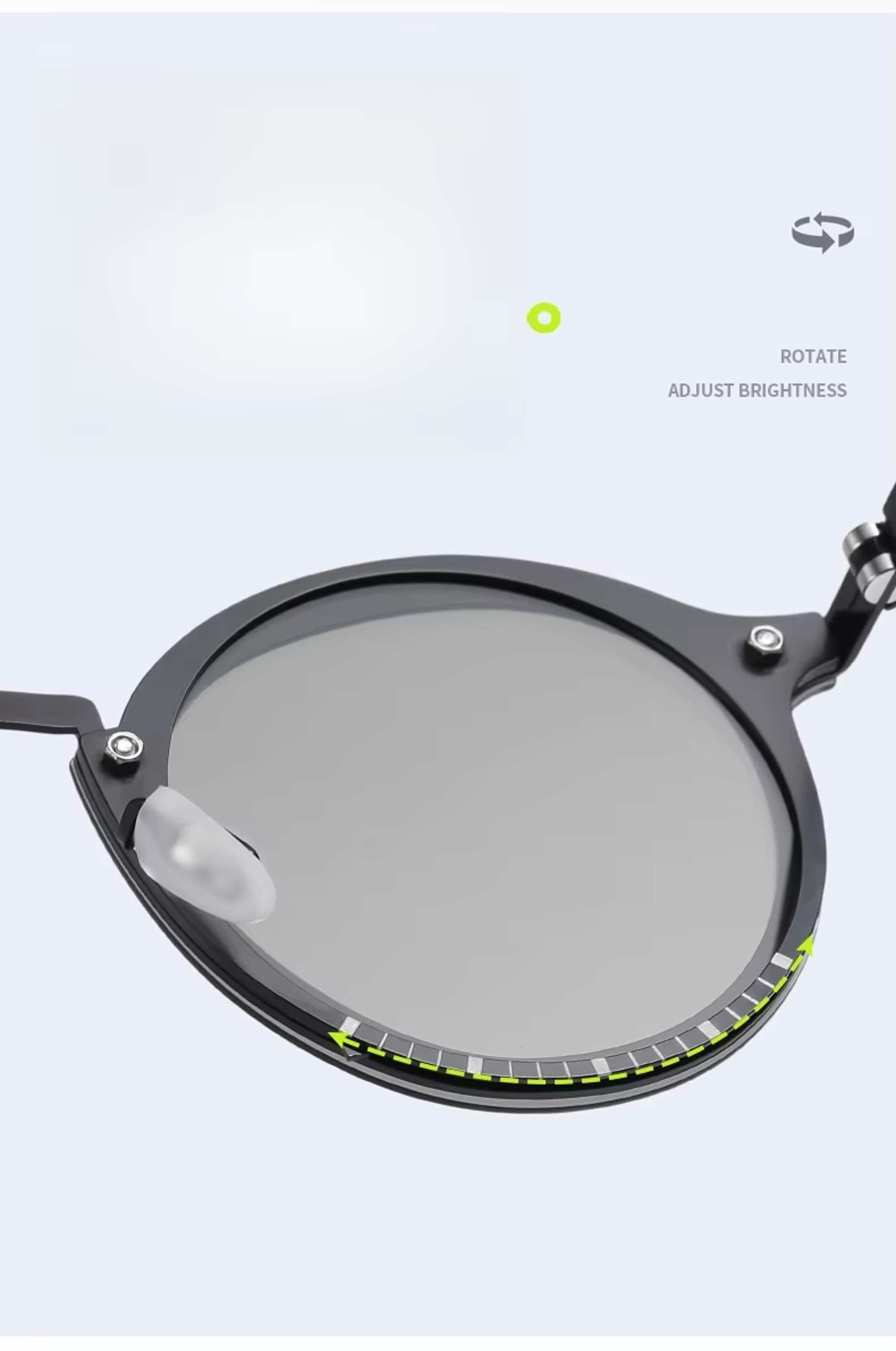 🕶️ Adjustable Tint Technology – Rotating 1–9 gear ND filter lenses let you manually shift from light grey to dark grey based on sunlight intensity.